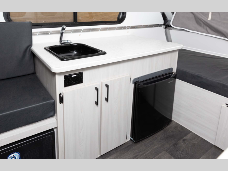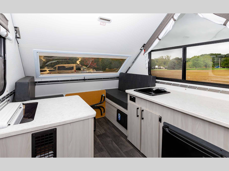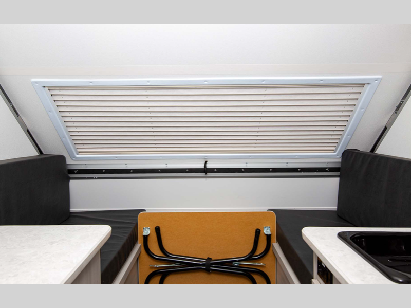 This camper is built lightweight with an Azdel composite roof/sidewalls for added durability, and there are four stabilizer jacks for stability. The interior provides sleeping accommodations on a front bed or the converted dinette, a sink to wash up, and storage for your clothing, gear and more.