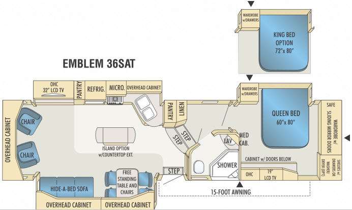 Triple Slide Emblem Fifth Wheel, Rear Lounge Chairs w/Overhead Cab., Hide-A-Bed Sofa & Free Standing Dinette Slide Out, 32" LCD TV/Pantry/Refrig./3 Burner Range/Micro./Overhead Cab. Slide Out, Dbl. Kitchen Sinks, Island Counter Opt., Pantry, Step Up Bath/Bedroom, Corner Shower, Linen, Toilet, Lav. w/Med. Cab., Mirror Cabinet, Front Queen Bed or Opt. King Bed Slide Out, Wall Ward. w/Mirror Doors, Shelves, Washer/Dryer Prep., Cabinet w/Doors, Safe, 19" LCD TV Overhead, 15" Awning & More.